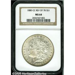 <B>1880/79-CC<img border='0' src='http://www.heritagecoins.com/images/star.gif' width=10 height=10>$1 Reverse of 1878 MS64 NGC.</B></I> VAM-4. A Top 100 Variety. Nicely struck for this scarcer Carson City issue, this lustrous piece has gentle chestnut color and relatively clean surfaces.