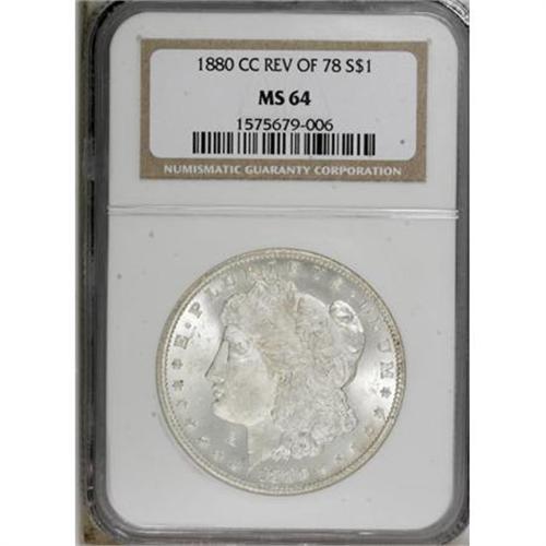 <B>1880/79-CC $1 Reverse of 1878 MS64 NGC.</B></I> NGC Census: (458/125). PCGS Population (981/435). Mintage: 591,000. Numismedia Wsl. Price for NGC/PCGS coin in MS64: $925. (#7108)<BR><BR><B>Coin Engraver:</B> George T. Morgan<BR><BR><b>Shipping:</b> Coins & Currency (<a target="_blank" href="http://www.heritageauctions.com/common/shipping.php">view shipping information</a>)