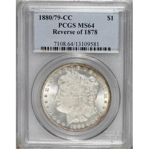 <B>1880/79-CC $1 Reverse of 1878 MS64 PCGS.</B></I> VAM-4. A Top 100 Variety. Sea-green and rose-red margins ensure the eye appeal of this lustrous and attentively struck Choice Carson City dollar. The reverse is remarkably free from marks.<BR><BR><b>Shipping:</b> Coins & Currency (<a target="_blank" href="http://www.heritageauctions.com/common/shipping.php">view shipping information</a>)