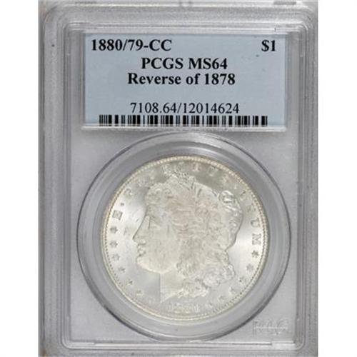 <B>1880/79-CC $1 Reverse of 1878 MS64 PCGS.</B></I> VAM-4. A Top 100 Variety. When magnified, the second half of the date shows clear underdigits. This Reverse of 1878 piece offers rich frost on the devices and lovely luster. The slightly hazy surfaces show more luster grazes than actual marks.<BR><BR><B>Coin Engraver:</B> George T. Morgan<BR><BR><b>Shipping:</b> Coins & Currency (<a target="_blank" href="http://www.heritageauctions.com/common/shipping.php">view shipping information</a>)