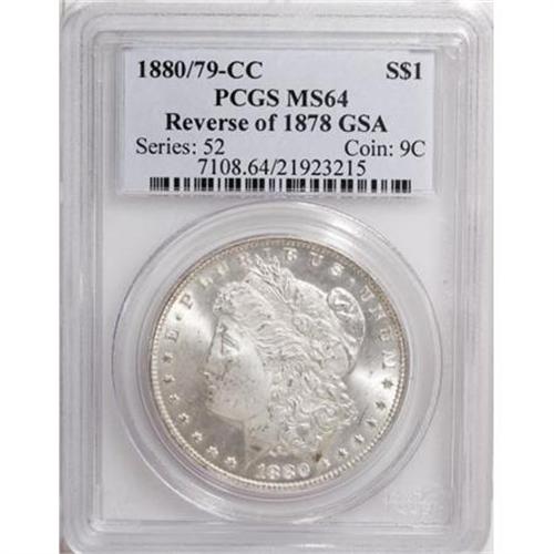 <B>1880/79-CC $1 Reverse of 1878 MS64 PCGS.</B></I> Ex: GSA. VAM-4. A Top 100 Variety. The popular VAM that combines the obsolete 1878 reverse with an obvious 80 over 79 overdate. Lightly toned and lustrous with a well preserved reverse.<BR><BR><B>Coin Engraver:</B> George T. Morgan<BR><BR><b>Shipping:</b> Coins & Currency (<a target="_blank" href="http://www.heritageauctions.com/common/shipping.php">view shipping information</a>)