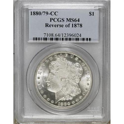 <B>1880/79-CC $1 Reverse of 1878 MS64 PCGS.</B></I> VAM-4. A Top 100 Variety. The two underdigits are plain when magnified on this attractive, frosty near-Gem. Minimally toned save for a touch of haze with vibrant luster and solid visual appeal.<BR><BR><B>Coin Engraver:</B> George T. Morgan<BR><BR><b>Shipping:</b> Coins & Currency (<a target="_blank" href="http://www.heritageauctions.com/common/shipping.php">view shipping information</a>)