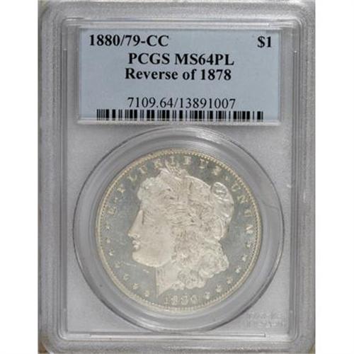 <B>1880/79-CC $1 Reverse of 1878 MS64 Prooflike PCGS.</B></I> VAM-4. A Top 100 Variety. This prominent CC-mint overdate variety is also noteworthy for its use of an obsolete reverse die. The VAM-4 appeared in quantity within the GSA hoard, but Prooflikes are very scarce. The depth of field reflectivity approaches a DMPL designation. A well struck and lightly toned example with good white-on-black contrast. Population: 28 in 64 Prooflike, 7 finer (6/07).<BR><BR><b>Shipping:</b> Coins & Currency (<a target="_blank" href="http://www.heritageauctions.com/common/shipping.php">view shipping information</a>)