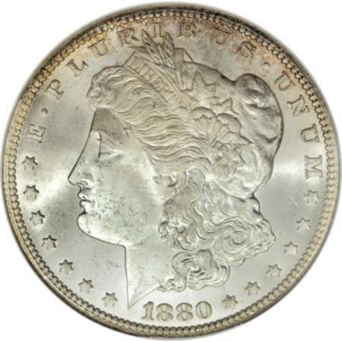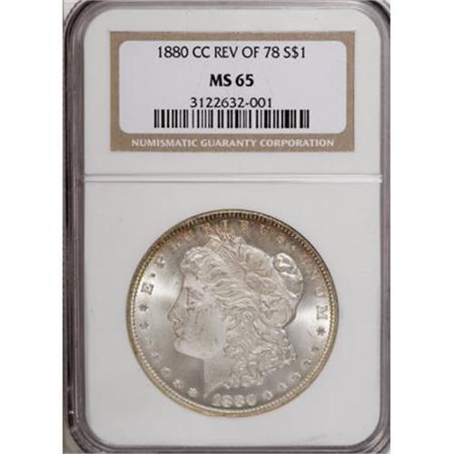 <B>1880/79-CC $1 Reverse of 1878 MS65 NGC.</B></I> VAM-4. A Top 100 Variety. Remains of an underlying 79 are visible in the last 8 and the 0 of the date. The reverse displays a parallel arrow feather. Whispers of reddish-patina gather at the margins of this attractive Gem, and a well executed strike lends strong definition to the design features, including the hair over Liberty's ear and the eagle's breast feathers. Some minor luster grazes likely preclude an even higher grade.<BR><BR><B>Coin Engraver:</B> George T. Morgan<BR><BR><b>Shipping:</b> Coins & Currency (<a target="_blank" href="http://www.heritageauctions.com/common/shipping.php">view shipping information</a>)