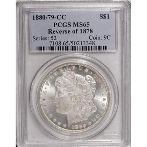 <B>1880/79-CC $1 Reverse of 1878 MS65 PCGS.</B></I> VAM-4. A Top 100 Variety. The boldest of the overdated obverses is paired with a Reverse of 1878 die. This decisively struck and highly appealing Gem offers incredible eye appeal with whispers of frost on the rose-inflected devices. Minimally toned otherwise. PCGS has certified 50 finer examples (1/08).<BR><I>From The Oxford Collection.</B></I><BR><BR><B>Coin Engraver:</B> George T. Morgan<BR><BR><b>Shipping:</b> Coins & Currency (<a target="_blank" href="http://www.heritageauctions.com/common/shipping.php">view shipping information</a>)