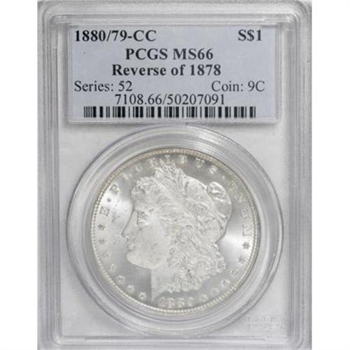 <B>1880/79-CC $1 Reverse of 1878 MS66 PCGS.</B></I> Probably no more than 10% to 20% of 1880-CC dollars survive with recognizable underdigits beneath the 80. On this coin, the 79 is especially strong. As such, this is both an absolute as well as a condition rarity among early Morgan dollars. As with all Carson City dollars, the surfaces are thickly frosted. As the mint luster swirls around each side, there are no obvious or detracting abrasions. Sharply struck also. Population: 48 in 66, 0 finer (6/07).<BR><I>From the Reuben Reinstein Collection.</B></I><BR><BR><b>Shipping:</b> Coins & Currency (<a target="_blank" href="http://www.heritageauctions.com/common/shipping.php">view shipping information</a>)
