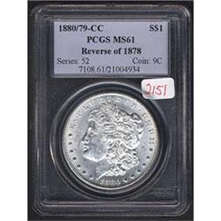 Morgan Dollars 1880/79-cc Reverse of 1878. PCGS graded Mint State 61. <b>Fully lustrous. The obverse has moderate contact marks, while the reverse grades higher. The Reverse of 1878 is characterized by flat breast feathers on the eagle.</b> <p align="center">Superior Galleries was founded in 1929 and has been a leader in