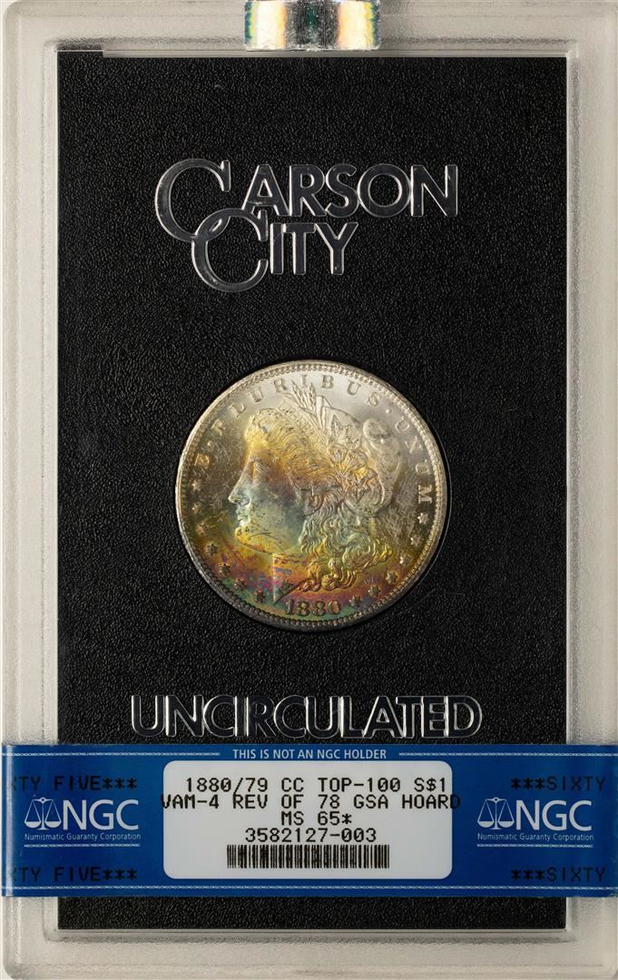 One 1880/79-CC Rev. of 78 $1 Morgan Silver Dollar Coin GSA NGC MS65 STAR Rainbow Toning. NGC Certified.
