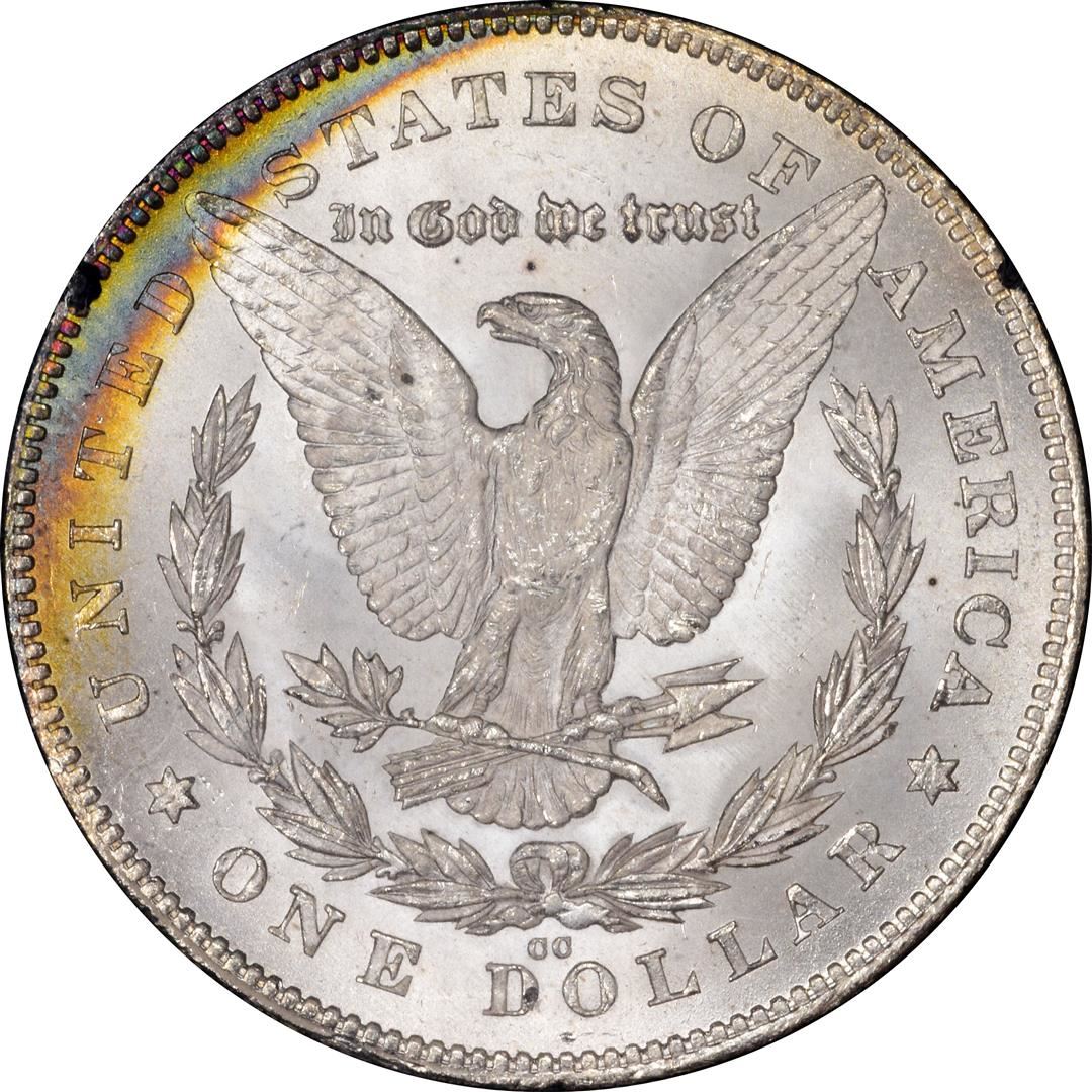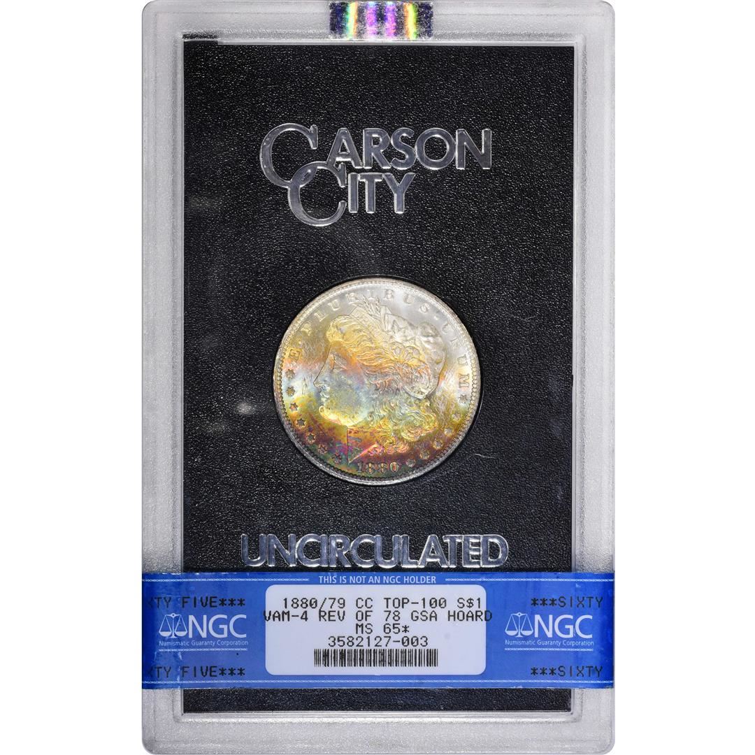 One 1880/79-CC Rev. of 78 $1 Morgan Silver Dollar Coin GSA NGC MS65 STAR Rainbow Toning. NGC Certified.
