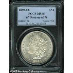 <B>1880/79-CC<img border='0' src='http://www.heritagecoins.com/images/star.gif' width=10 height=10>$1 Reverse of 1878 MS65 PCGS.</B></I> VAM-4. A Top 100 Variety. One of only two 1880-CC Reverse of 1878 VAMs, the other is VAM-7. VAM-4 is also popular due to its prominent overdate, the 79 underdigits are irrefutable. A dusting of tan color denies full brilliance. The 1880-CC is not known for its sharp strike, but the definition on the present piece is certainly above average, since the hair above the ear is well delineated and has only a hint of softness. This carefully preserved Gem will be a highlight of any Carson City holding.<BR><I>From The Banks Collection.</B></I> Lot:9979