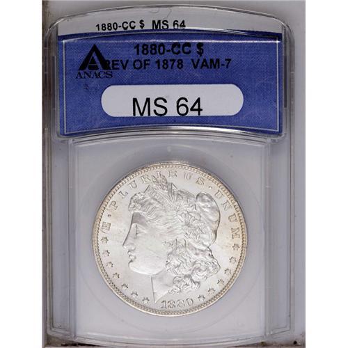 <B>1880-CC<img border='0' src='http://www.heritagecoins.com/images/star.gif' width=10 height=10>$1> Reverse of 1878 MS64 ANACS.</B></I> VAM-7. A dash is noted beneath the second 8 in the date. Silver-gray surfaces display wisps of light tan-gold at the borders, and the design features are well impressed, including nice definition in the hair over Liberty's ear and on the eagle's breast feathers. Just a couple of trivial marks prevent an even higher grade. <BR><BR><B>Important notice:</B> Heritage usually auctions material at the rate of 200-250 lots per hour. On some occasions eBay Live bid software or the Internet may not be able to keep up with the pace of the auction. We recommend placing a realistic absentee bid now as insurance to avoid disappointment. Occasionally the auctioneer may eliminate or reject an eBay Live bid, and the auctioneer may also reopen a lot after the close of the eBay live bidding (usually because we missed an audience bid), and may reject your bid even if it shows you as the winning bidder. By bidding via eBay Live, you agree that Heritage may award the lot to another bidder at its sole discretion under the circumstances described above or any other reasonable circumstances. Since eBay bids are not shown to us until we open the lot on the floor, we treat those bids just like floor bids. In most cases the floor responds before the eBay bid is presented to us, due to Internet lag time, so for consistency we have made it a policy that floor bids are always considered first over tie eBay live bids. Also please note that all Heritage lots purchased through eBay Live carry a 20% Buyer's Premium. Please make sure you read the Terms and Conditions before you bid. This lot is being auctioned in conjunction with a live floor auction by Heritage Galleries & Auctioneers. All final auction and invoice information will be supplied by Heritage Galleries & Auctioneers, and all other information should be considered preliminary. Lot:3279 <BR><BR><B>Winning Notification and Billing:</B> After the FINAL session in this auction is complete, Heritage will send e-mail and snail mail invoices. This process normally takes several days. All final auction and invoice information will be supplied by Heritage Galleries & Auctioneers, and all other information should be considered preliminary. <BR><BR>This auction will be conducted on a live auction floor and over the Internet through eBay Live. If you choose to place an absentee bid, please take a moment to <font color='#0000ff'><u><a href='http://pages.ebay.com/liveauctions/help/before/laabsentee.html'>learn how eBay Live absentee bidding works</a></u></font><font color='#000000'>