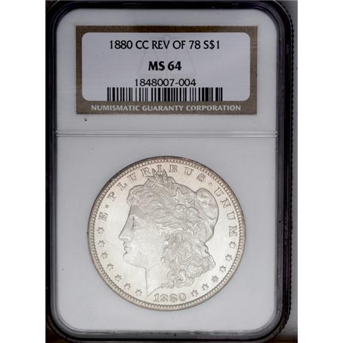 <B>1880/79-CC<img border='0' src='http://www.heritagecoins.com/images/star.gif' width=10 height=10>$1> Reverse of 1878 MS64 NGC.</B></I> VAM-4, A Top 100 Variety. Remnants of an underlying 79 are clearly visible within the second 8 and 0 of the date. Well struck with frosty surfaces, pretty golden rim toning, and a few grade-limiting marks on Liberty's cheek and neck.