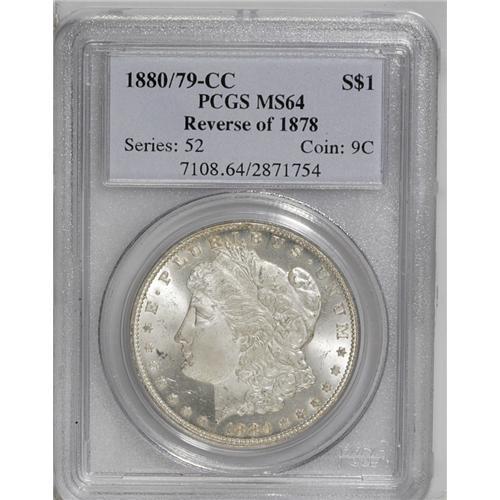 <B>1880/79-CC<img border='0' src='http://www.heritagecoins.com/images/star.gif' width=10 height=10>$1> Reverse of 1878 MS64 PCGS.</B></I> VAM-4. A Top 100 Variety. Creamy surfaces and frosted devices give this coin great eye appeal. Nicely struck with the major overdate plain under magnification.