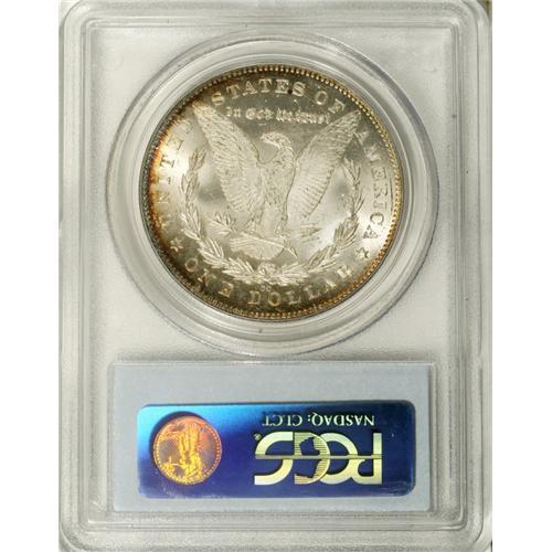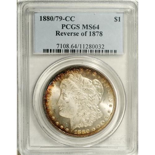 <B>1880/79-CC S$1 Reverse of 1878 MS64 PCGS.</B></I> VAM-4. A Top 100 Variety. The underdigits 79 are visible beneath the 80, and the reverse has the Parallel (top) Arrow Feather style of the 1878 issues. A sliver of reddish-gold toning gravitates to portions of the rims on this impressively struck near-Gem. A few trivial obverse marks limit the grade.<BR><BR><b>Shipping:</b> Coins & Currency (<a target="_blank" href="http://www.heritageauctions.com/common/shipping.php">view shipping information</a>)