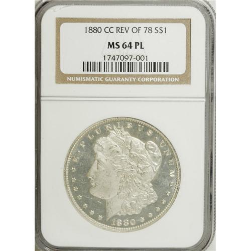 <B>1880/79-CC S$1 Reverse of 1878 MS64 Prooflike NGC.</B></I> VAM-4. A Top 100 Variety. The fields are impressively mirrored, and the devices are intricately detailed. A carefully preserved example of this significant Carson City variety, which has both an obsolete reverse hub and an obvious 79 underdate.<BR><BR><b>Shipping:</b> Coins & Currency (<a target="_blank" href="http://www.heritageauctions.com/common/shipping.php">view shipping information</a>)