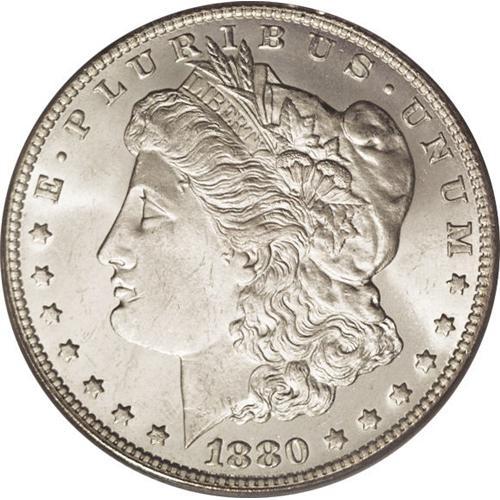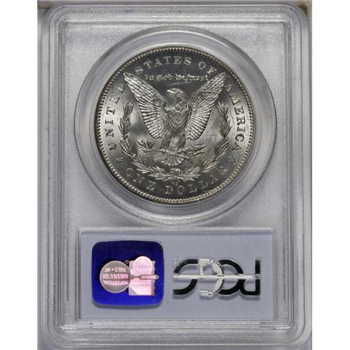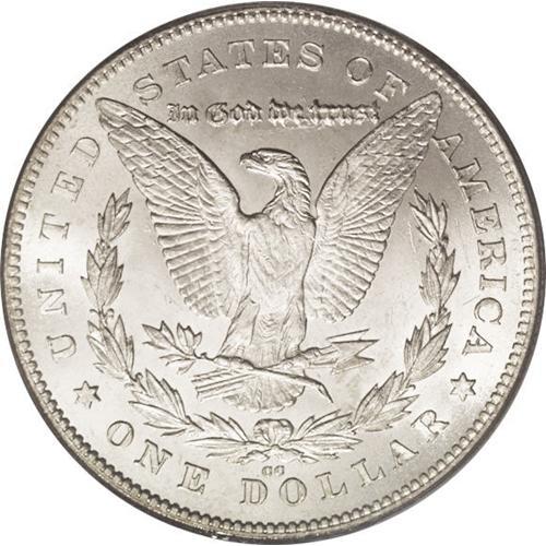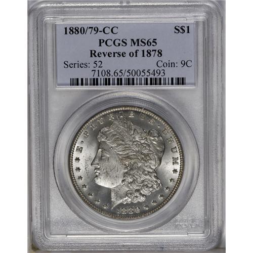 <B>1880/79-CC<img border='0' src='http://www.heritagecoins.com/images/star.gif' width=10 height=10>$1> Reverse of 1878 MS65 PCGS.</B></I> VAM-4. A Top 100 Variety. Lustrous and brilliant with exquisite satiny fields and just a few scattered marks on the obverse. Clear evidence shows of the 7 under the second 8, and the 9 under the 0. Well preserved throughout; a no-questions Gem example.<BR><I>From The Chicago-Ark Collection.</B></I>