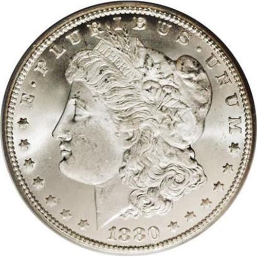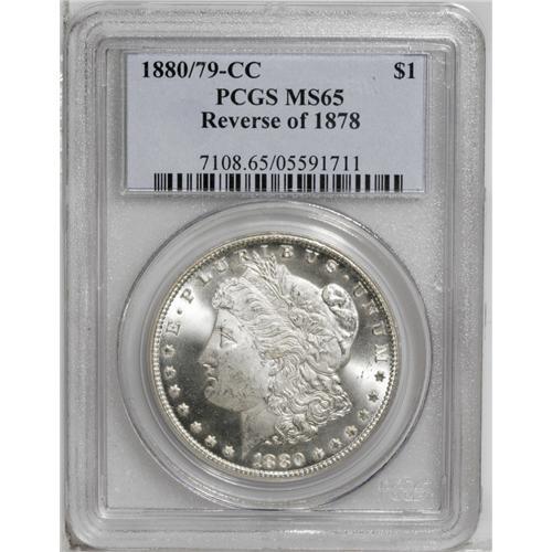<B>1880/79-CC<img border='0' src='http://www.heritagecoins.com/images/star.gif' width=10 height=10>$1> Reverse of 1878 MS65 PCGS.</B></I> VAM-4. A Top 100 Variety. The silver-white surfaces are thick with mint frost on the devices, and well mirrored fields, even though not meriting a Cameo designation. Radiant luster emanates from both sides, and only a few stray ticks and luster grazes separate this lovely piece from an MS66 grade.