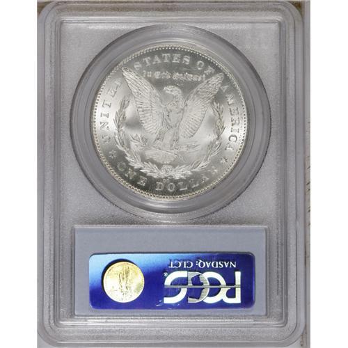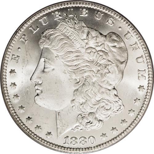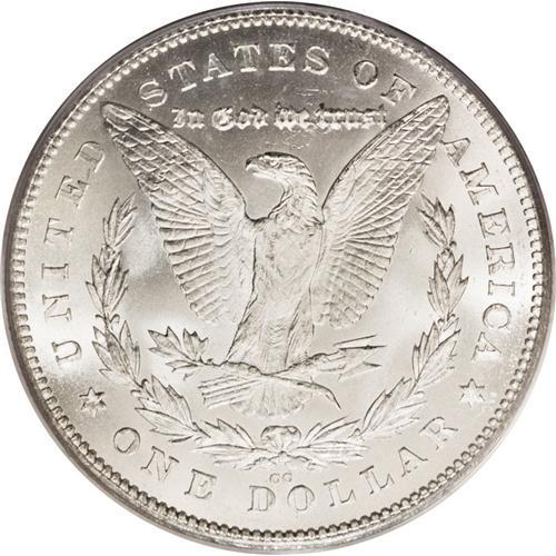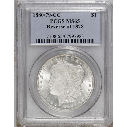 <B>1880/79-CC<img border='0' src='http://www.heritagecoins.com/images/star.gif' width=10 height=10>$1> Reverse of 1878 MS65 PCGS.</B></I> VAM-4. A Top 100 Variety. This variety, along with the VAM-7, the so-called 8/7 Dash, marks the final appearance of the Reverse of 1878, with parallel top arrow feathers. The 1880/79-CC is popular as the most visible overdate in the series. The present example offers brilliant, unabraded silver-white surfaces with good field-device contrast.