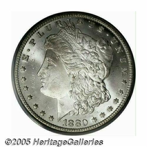 <B>1880/79-CC<S$1> Reverse of 1878 MS65 PCGS.</B></I> VAM-4. A Top 100 Variety. One of only two 1880-CC Reverse of 1878 VAMs, the other is VAM-7. VAM-4 is also popular due to its prominent overdate, the 79 underdigits are irrefutable. This specimen is sharply struck, with virtually all of the design elements well brought up. Traces of light tan color visit the motifs, while the fields retain more of a silvery color. Aside from a few minor scuffs on Liberty's cheek and neck and in the left (facing) obverse field, the surfaces are nearly pristine. PCGS has certified only 44 pieces finer (4/05).