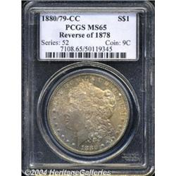 <B>1880/79-CC<S$1> Reverse of 1878 MS65 PCGS.</B></I> This scarcer variant was struck from a leftover reverse die from 1878, which has the first (flat breast) eagle design. A scarce coin in the better grades of Mint State, this is a lovely, lustrous Gem that displays rich golden-brown and blue patina on the obverse, while the reverse is mostly brilliant with an outline of golden around the margin. <BR><BR><B>Important notice:</B> Heritage usually auctions material at the rate of 200-250 lots per hour. On some occasions eBay Live bid software or the Internet may not be able to keep up with the pace of the auction. We recommend placing a realistic absentee bid now as insurance to avoid disappointment. Occasionally the auctioneer may eliminate or reject an eBay Live bid, and the auctioneer may also reopen a lot after the close of the eBay live bidding (usually because we missed an audience bid), and may reject your bid even if it shows you as the winning bidder. By bidding via eBay Live, you agree that Heritage may award the lot to another bidder at its sole discretion under the circumstances described above or any other reasonable circumstances. Since eBay bids are not shown to us until we open the lot on the floor, we treat those bids just like floor bids. In most cases the floor responds before the eBay bid is presented to us, due to Internet lag time, so for consistency we have made it a policy that floor bids are always considered first over tie eBay live bids. Also please note that all Heritage lots purchased through eBay Live carry a 20% Buyer's Premium. Please make sure you read the Terms and Conditions before you bid. </span></font></tr></table></td></tr></table>