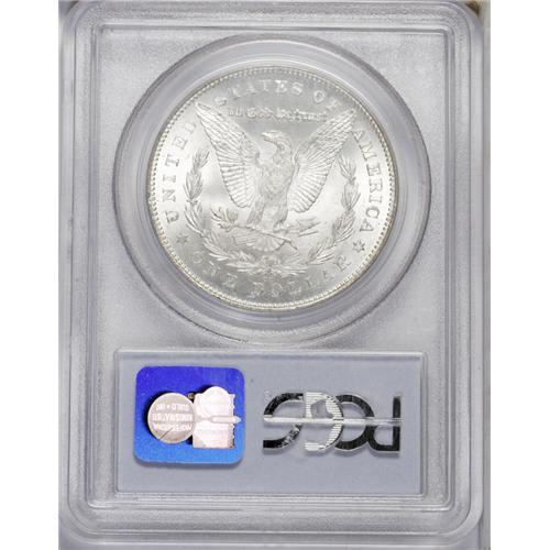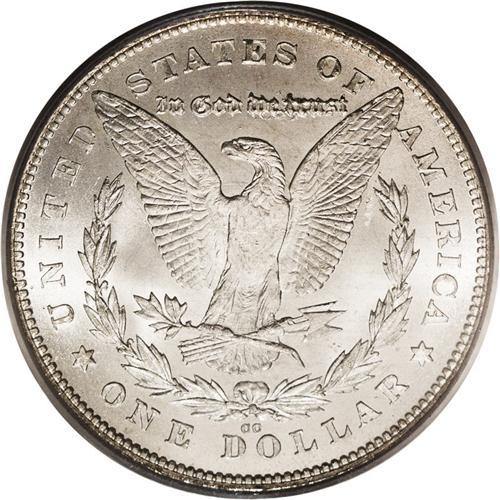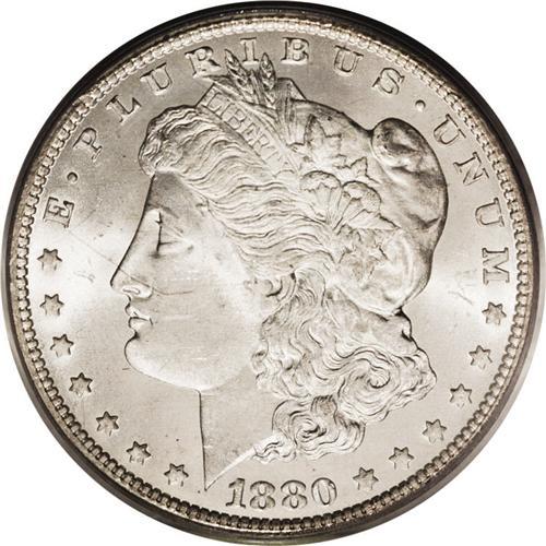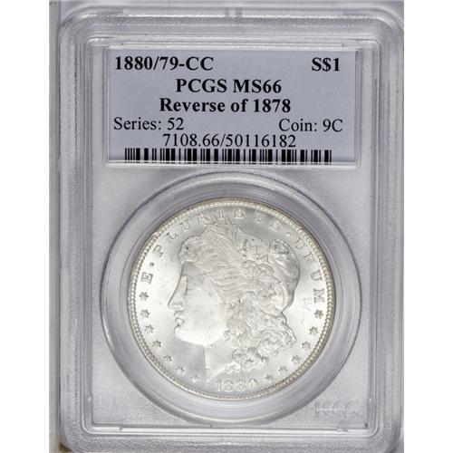 <B>1880/79-CC<img border='0' src='http://www.heritagecoins.com/images/star.gif' width=10 height=10>$1> Reverse of 1878 MS66 PCGS.</B></I> VAM-4. A Top 100 Variety. A leftover reverse die was used for some of the silver dollar coinage in Carson City during 1880. Perhaps the use of this reverse die from 1878 represented an emergency at that Mint. Most likely the new reverse dies for that coinage became unserviceable through extensive use, and the old reverse dies were placed back into service. This example has a sharp overdate obverse with much of the 79 visible beneath the 80. It is a lovely Premium Gem with frosty luster and brilliant silver surfaces. This example is one of the finest available. Population: 46 in 66, 0 finer (7/06).