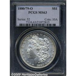 <B>1880/79-O<img border='0' src='http://www.heritagecoins.com/images/star.gif' width=10 height=10>$1 MS63 PCGS.</B></I> VAM-4. A Hot 100 Variety. Micro O. Dappled golden-brown patina cedes to pearl-gray centers. This well struck piece has a beautiful reverse and a clean cheek, but a few wispy blemishes on the left obverse prevent a finer grade.