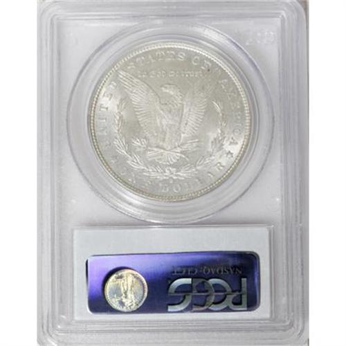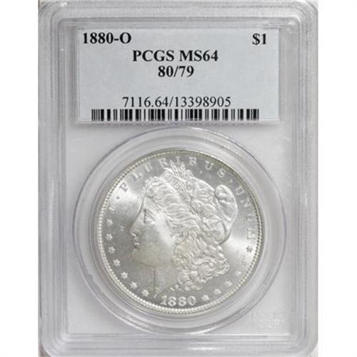 <B>1880/79-O $1 MS64 PCGS.</B></I> VAM-4. A Top 100 Variety. Micro O. This is a very appealing example that possesses several interesting features. It is attributed by PCGS as a 1880/79 overdate, and it also displays a Micro O mintmark. The first 8 in the date is broadly doubled. A rather deep adjustment mark--or possibly a roller mark--bisects the reverse, passing directly through the eagle's lower abdomen; and this mint-made characteristic should not affect the technical grade of the piece. Boldly struck, lightly toned, and minimally marked, an attractive and interesting Morgan dollar from the New Orleans Mint. <BR><BR><B>Coin Engraver:</B> George T. Morgan<BR><BR><b>Shipping:</b> Coins & Currency (<a target="_blank" href="http://www.heritageauctions.com/common/shipping.php">view shipping information</a>)