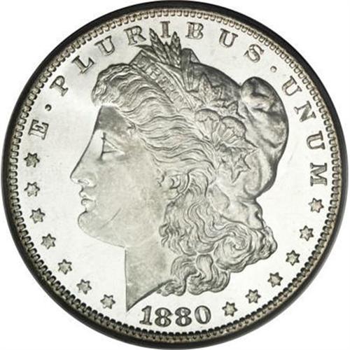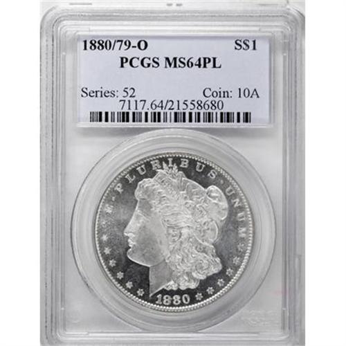 <B>1880/79-O $1 MS64 Prooflike PCGS.</B></I> VAM-4. A Top 100 Variety. The underdigits beneath the 80 appear like smudges in the upper part of those digits with nowhere near the crispness seen on the Carson City dollars of this date. The fields are brightly reflective and set off the heavily frosted devices with a cameo effect. Brilliant throughout and sharply struck. A lovely example of this rare issue with prooflike fields. Population: 14 in 64, 0 finer (1/08).<BR><I>From The Jimmy G. PCGS Registry Collection of Morgan Dollars with Varieties.</B></I><BR><BR><B>Coin Engraver:</B> George T. Morgan<BR><BR><b>Shipping:</b> Coins & Currency (<a target="_blank" href="http://www.heritageauctions.com/common/shipping.php">view shipping information</a>)
