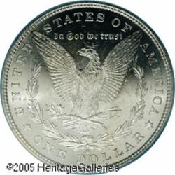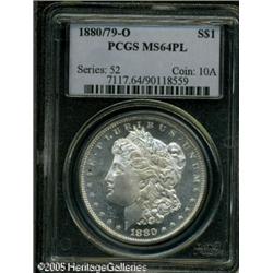 <B>1880/79-O<img border='0' src='http://www.heritagecoins.com/images/star.gif' width=10 height=10>$1 MS64 Prooflike PCGS.</B></I> VAM-5. Top 100 Variety. The upper loop of the second 8 in the date has remnants of the crossbar of a 7. Tall 'medium' mintmark. Scarcer than VAM-4, which is the other 1880/79-O variety. A brilliant and well struck near-Gem with splendid contrast and obviously prooflike fields. The cheek but the fields exhibit a few luster grazes, particularly on the obverse. Among the finest 1880/79-O Dollars certified by PCGS. Population: 11 in 64, 0 finer (1/05). Lot:9989