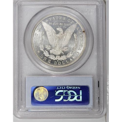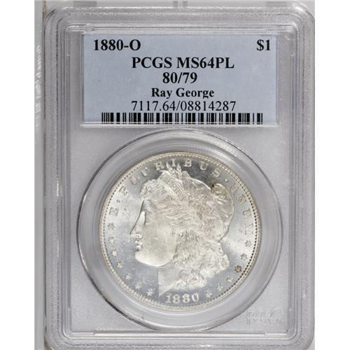 <B>1880/79-O S$1 MS64 Prooflike PCGS.</B></I> Ex: Ray George. VAM-4. A Top 100 Variety. This popular VAM variety, the so-called "80/79" overdate, shows a diagonal sliver of the 7 inside the second 8, with a small clear area above and just under the bottom border of the loop top, unlike the VAM-5 "8/7" overdate, which shows the remains of a 7 all the way to the loop top. This lovely, brilliant near-Gem offers superb field-device contrast with a few minuscule abrasions that preclude a finer grade (11/06).<BR><I>From The Cocoa Beach Collection.</B></I><BR><BR><b>Shipping:</b> Coin/Currency (<a target="_blank" href="http://www.heritageauctions.com/common/shipping.php">view shipping information</a>)
