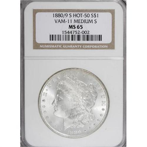 <B>1880/79-S $1 Medium S MS65 NGC.</B></I> Hot 50 Vam-11. NGC Census: (0/0). PCGS Population (206/101). (#7122)<BR><BR><B>Coin Engraver:</B> George T. Morgan<BR><BR><b>Shipping:</b> Coins & Currency (<a target="_blank" href="http://www.heritageauctions.com/common/shipping.php">view shipping information</a>)