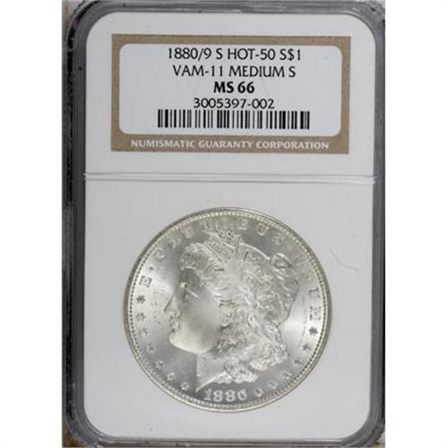 <B>1880/79-S $1 Medium S MS66 NGC.</B></I> VAM-11, Hot 50. NGC Census: (0/0). PCGS Population (76/20). (#7122)<BR><BR><B>Coin Engraver:</B> George T. Morgan<BR><BR><b>Shipping:</b> Coins & Currency (<a target="_blank" href="http://www.heritageauctions.com/common/shipping.php">view shipping information</a>)
