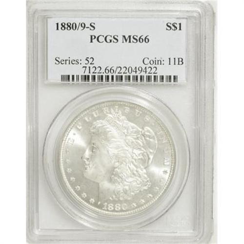 <B>1880/79-S $1 MS66 PCGS.</B></I> VAM-11. A Hot 50 Variety. Medium S. A nearly brilliant example of this popular VAM variety, practically untoned with the faintest trace of tan on each side. Both sides offer spectacular luster with impressive frost on the exquisitely preserved devices.<BR><BR><B>Coin Engraver:</B> George T. Morgan<BR><BR><b>Shipping:</b> Coins & Currency (<a target="_blank" href="http://www.heritageauctions.com/common/shipping.php">view shipping information</a>)