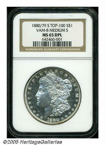 <B>1880/79-S<S$1> MS65 Deep Mirror Prooflike NGC.</B></I> VAM-8. A Top 100 Variety. Medium S. Magnificently mirrored fields and attractive cameo frost on the devices confirms the charm of this well struck and brilliant Gem. The cheek is refreshingly unmarked.
