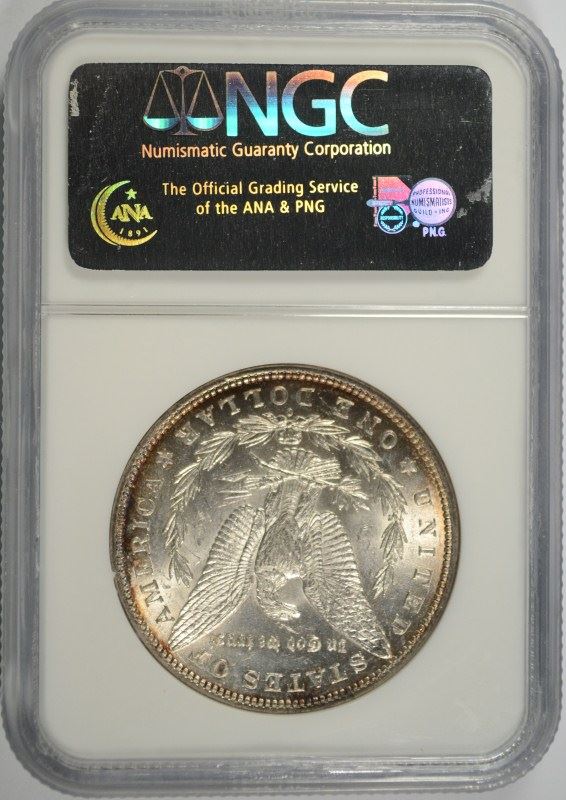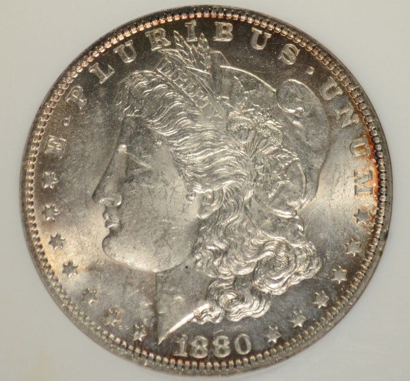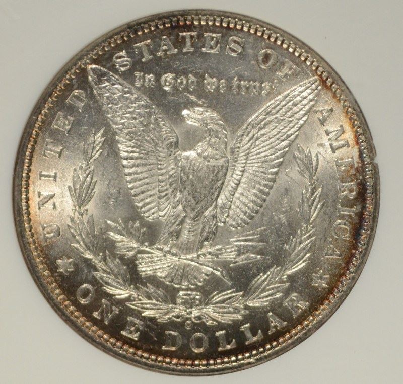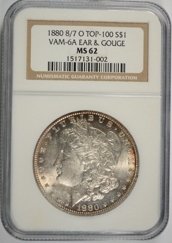 1880 8/7-O TOP-100 MORGAN SILVER DOLLAR, VAM-6A EAR & GOUGE, NGC MS-62