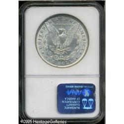 <B>1880<img border='0' src='http://www.heritagecoins.com/images/star.gif' width=10 height=10>$1 8 Over 7 MS61 NGC.</B></I> VAM-6. A Top 100 Variety. Dramatic "spikes" of a 7 show above the top of the loop of the second 8 in the date. The crossbar of the 7 is also seen within the upper loop of the 8. This example is fully lustrous with slight softness in the hair over Liberty's ear and moderately abraded surfaces. Lot:9962