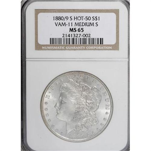 <B>1880/9-S $1 Medium S MS65 NGC.</B></I> Vam-11 Hot-50. NGC Census: (0/0). PCGS Population (208/101). (#7122)<BR><BR><B>Coin Engraver:</B> George T. Morgan<BR><BR><b>Shipping:</b> Coins & Currency (<a target="_blank" href="http://www.heritageauctions.com/common/shipping.php">view shipping information</a>)