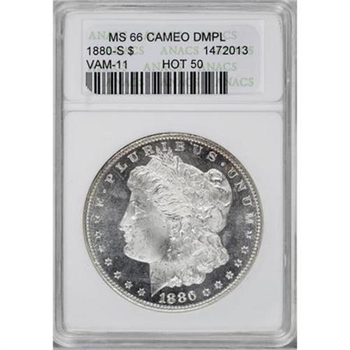 <B>1880/9-S $1 MS66 Cameo Deep Mirror Prooflike ANACS.</B></I> VAM-11. A Hot 50 Variety. Richly frosted, sharply struck devices emerge from deeply reflective mirrors that show scattered haze and occasional russet peripheral accents. This subtle overdate variant's most visible diagnostic is a die flaw in the upper half of the 0 in the date.<BR><BR><b>Shipping:</b> Coins & Currency (<a target="_blank" href="http://www.heritageauctions.com/common/shipping.php">view shipping information</a>)