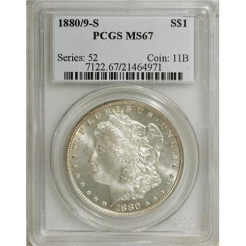 <B>1880/9-S $1 MS67 PCGS.</B></I> VAM-11. A Hot 50 Variety. Die fill within the 0 is suggestive of a largely effaced 9. An intricately struck Superb Gem with a semi-prooflike obverse and a vivaciously lustrous reverse. Brilliant save for golden-brown and sea-green reverse peripheral toning. Population: 19 in 67, 1 finer (12/07).<BR><I>From The Jimmy G. PCGS Registry Collection of Morgan Dollars with Varieties.</B></I><BR><BR><B>Coin Engraver:</B> George T. Morgan<BR><BR><b>Shipping:</b> Coins & Currency (<a target="_blank" href="http://www.heritageauctions.com/common/shipping.php">view shipping information</a>)