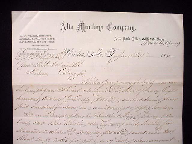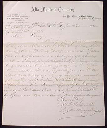 1880 ALTA MONTANA CO, MINING CO., LETTERHEAD - WICKES, MONT. TERRITORY