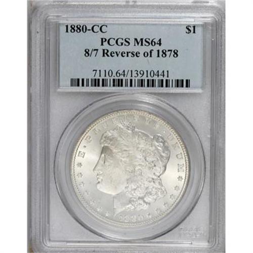 <B>1880-CC $1 8/7 Reverse of 1878 MS64 PCGS.</B></I> VAM-7. One of only two Reverse of 1878 VAMs for the issue. Evidence of the 7 underdigit is limited to a dash beneath the second 8. Lustrous and nearly untoned with a good strike and smooth fields.<BR><BR><B>Coin Engraver:</B> George T. Morgan<BR><BR><b>Shipping:</b> Coins & Currency (<a target="_blank" href="http://www.heritageauctions.com/common/shipping.php">view shipping information</a>)