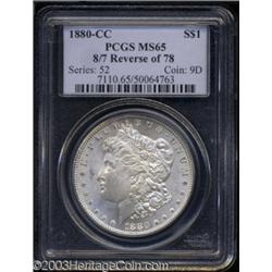 <table><tr><td><TABLE cellSpacing=0 cellPadding=0 width="100%" bgColor=#000000 border=0><TBODY> <TR><TD width="100%"><TABLE cellSpacing=1 cellPadding=3 width="100%" border=0><TBODY><TR><TD width="100%" bgColor=#79735c><FONT face=arial color=#ffffff size=3><B>Description</B> </FONT></TD></TR><TR><TD width="100%" bgColor=#ffffff><FONT face=arial size=2><B>1880-CC $1 8/7 Reverse of 1878 MS65 PCGS.</B></I> The base of a largely effaced prior 7 appears as a dash below the second 8 in the date. Wispy streaks of tan patina grace this lovingly preserved Carson City Dollar. The cheek is especially clean. An exquisitely struck Gem that has frosty semi-prooflike luster. Struck from clashed dies. Population: 52 in 65, 14 finer (9/03). </FONT></TD></TR></TBODY></TABLE></TD></TR></TBODY></TABLE><BR><A name=PricesRealized></A><TABLE cellSpacing=0 cellPadding=0 width="100%" bgColor=#000000 border=0><TBODY><TR><TD width="100%"><TABLE cellSpacing=1 cellPadding=3 width="100%" border=0><TBODY><TR><TD width="100%" bgColor=#79735c><A name=PR><FONT face=arial color=#ffffff size=3><B>Previous Prices from Heritage Auctions</B> </FONT></A></TD></TR><TR><TD bgColor=#f6f6ed><TABLE cellSpacing=0 cellPadding=0 width="100%" border=1><TBODY><TR><TD align=middle width="33%"><B>Date</B></TD><TD align=middle width="33%"><B>Service</B></TD><TD align=middle width="33%"><B>Price</B></TD></TR><TR bgColor=whitesmoke><TD width="33%"><B>03/23/2003</B></TD><TD width="33%">PCGS</TD><TD width="33%">$4,715.00</TD></TR><TR bgColor=whitesmoke><TD width="33%"><B>01/10/1998</B></TD><TD width="33%">ANACS</TD><TD width="33%">$1,667.50</TD></TR><TR bgColor=whitesmoke><TD width="33%"><B>11/01/1998</B></TD><TD width="33%">NGC</TD><TD width="33%">$1,380.00</TD></TR><TR bgColor=whitesmoke><TD width="33%"><B>11/01/1998</B></TD><TD width="33%">PCGS</TD><TD width="33%">$1,725.00</TD></TR><TR bgColor=whitesmoke><TD width="33%"><B>03/01/2000</B></TD><TD width="33%">PCGS</TD><TD width="33%">$1,725.00</TD></TR></TBODY></TABLE></TD></TR><TR><TD bgColor=#ffffff><FONT face=arial size=1 ?>PLEASE NOTE: All prices realized reflect the final hammer price PLUS the buyer's premium in auctions that charge a buyer's premium. Each item has a notation at the top of the listing indicating whether that lot included a buyer's premium. Example: A item that sells with a final hammer price of $100 and a 20% buyer's premium will display with a price realized of $120. All information listed is intended to be as accurate as possible, but errors are possible. Please use this guide carefully and inform us of any inaccuracies. </FONT></TD></TR></TBODY></TABLE></TD></TR></TBODY></TABLE><BR><TABLE cellSpacing=0 cellPadding=0 width="100%" bgColor=#000000 border=0><TBODY><TR><TD width="100%"><TABLE cellSpacing=1 cellPadding=3 width="100%" border=0><TBODY><TR><TD width="100%" bgColor=#79735c colSpan=6><FONT face=arial color=#ffffff size=3><B>Price Guide*</B> </FONT></TD></TR><TR bgColor=#f6f6ed><TD align=middle><B>Grade</B> </TD><TD align=middle><B>Coin World<BR>(Trends)</B> </TD><TD align=middle><B>Numismedia<BR>Retail</B> </TD><TD align=middle><B>Numismedia<BR>Wholesale</B> </TD><TD align=middle><B>Coin<BR>Universe</B> </TD><TD align=middle><B>Heritage<BR>Value Index</B> </TD></TR><TR bgColor=#ffffff><TD align=middle>64</TD><TD align=right>---</TD><TD align=right>---</TD><TD align=right>---</TD><TD align=right>$650.00</TD><TD align=right>$558.13</TD></TR><TR style="FONT-WEIGHT: bold" bgColor=#cccfdd><TD align=middle>65</TD><TD align=right>---</TD><TD align=right>---</TD><TD align=right>---</TD><TD align=right>$2,650.00</TD><TD align=right>$1,855.00</TD></TR><TR bgColor=#ffffff><TD align=middle>66</TD><TD align=right>---</TD><TD align=right>---</TD><TD align=right>---</TD><TD align=right>$5,600.00</TD><TD align=right>$4,885.00</TD></TR><TR bgColor=#ffffff><TD colSpan=6><FONT size=1>*All information listed is intended to be as accurate as possible, but errors are possible. No item may be returned or refused based on this information which is provided as a service to our customers. You should contact each pricing source directly to determine the accuracy of this information. </FONT></TD></TR></TBODY></TABLE></TD></TR></TBODY></TABLE><BR><TABLE cellSpacing=0 cellPadding=0 width="100%" bgColor=#000000 border=0><TBODY><TR><TD width="100%"><TABLE cellSpacing=1 cellPadding=3 width="100%" border=0><TBODY><TR><TD width="100%" bgColor=#79735c><FONT face=arial color=#ffffff size=3><B>Population Guide</B> </FONT></TD></TR><TR bgColor=#ffffff><TD align=middle><!-- Begin Output of Population Grid--><TABLE cellSpacing=0 cellPadding=0 width="100%" border=0><TBODY><TR><TD vAlign=center><TABLE cellSpacing=0 width="100%" border=1 cellsadding="3"><TBODY><TR><TD vAlign=center><TABLE cellSpacing=0 cellPadding=3 width="100%" border=1><TBODY><TR><TD vAlign=center align=middle bgColor=#f0f1e8 colSpan=2 <CENTER><FONT face=Arial size=2><B>PCGS Pop </B></FONT><CENTER></CENTER></TD><TD vAlign=center align=middle bgColor=#f0f1e8 colSpan=2><CENTER><FONT face=Arial size=2><B>NGC Pop</B></CENTER></FONT></TD></TR><TR><TD vAlign=center><FONT face=Arial size=2>(65)</FONT> </TD><TD vAlign=center align=right><FONT face=Arial size=2>58</FONT> </TD><TD vAlign=center><FONT face=Arial size=2>(65)</FONT> </TD><TD vAlign=center align=right><FONT face=Arial size=2>0</FONT> </TD></TR><TR><TD vAlign=center><FONT face=Arial size=2>(>65)</FONT> </TD><TD vAlign=center align=right><FONT face=Arial size=2>22</FONT> </TD><TD vAlign=center><FONT face=Arial size=2>(>65)</FONT> </TD><TD vAlign=center align=right><FONT face=Arial size=2>0</FONT> </TD></TR></TBODY></TABLE></TD></TR></TBODY></TABLE></TD></TR></TBODY></TABLE><!-- End Output of Population Grid--></TD></TR></TBODY></TABLE></TD></TR></TBODY></TABLE><BR><TABLE cellSpacing=0 cellPadding=0 width="100%" bgColor=#000000 border=0><TBODY><TR> Important notice: Heritage usually auctions material at the rate of 200-250 lots per hour. On some occasions eBay Live bid software or the I
