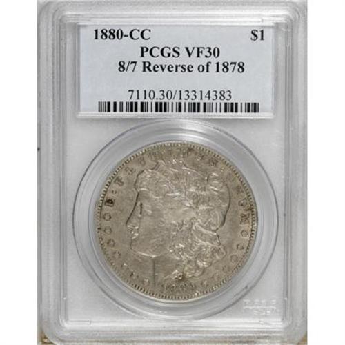 <B>1880-CC $1 8/7 Reverse of 1878 VF30 PCGS.</B></I> . PCGS Population (1/406). NGC Census: (0/0). (#7110)<BR><BR><B>Coin Engraver:</B> George T. Morgan<BR><BR><b>Shipping:</b> Coins & Currency (<a target="_blank" href="http://www.heritageauctions.com/common/shipping.php">view shipping information</a>)