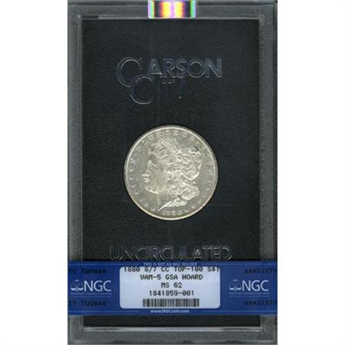 <B>1880-CC $1 8 Over High 7 MS62 NGC. VAM-5. A Top 100 Variety.</B></I> GSA Box and Cert Card are included. NGC Census: (0/0). PCGS Population (33/581). (#7102)<BR><BR><B>Coin Engraver:</B> George T. Morgan<BR><BR><b>Shipping:</b> Coins & Currency (<a target="_blank" href="http://www.heritageauctions.com/common/shipping.php">view shipping information</a>)