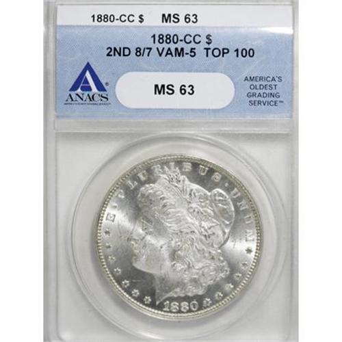 <B>1880-CC $1 8 Over High 7 MS63 ANACS.</B></I> VAM-5. A Top 100 Variety. PCGS Population (95/403). (#7102)<BR><BR><B>Coin Engraver:</B> George T. Morgan<BR><BR><b>Shipping:</b> Coins & Currency (<a target="_blank" href="http://www.heritageauctions.com/common/shipping.php">view shipping information</a>)