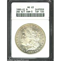 <TR><TD width="100%"><TABLE cellSpacing=1 cellPadding=3 width="100%" border=0><TBODY><TR><TD width="100%" bgColor=#79735c><FONT face=arial color=#ffffff size=3><B>Description</B> </FONT></TD></TR><TR><TD width="100%" bgColor=#ffffff><FONT face=arial size=2><B>1880-CC $1 8 Over High 7 MS63 ANACS.</B></I> VAM-5. Top 100 Variety. A shallow planchet flaw (as made) rests below the lowest hair curls. Nicely struck and mildly prooflike with pastel apricot and steel-blue patina. The reverse is well preserved, while the jaw has a minor contact mark. </FONT></TD></TR></TBODY></TABLE></TD></TR></TBODY></TABLE><BR><A name=PricesRealized></A><TABLE cellSpacing=0 cellPadding=0 width="100%" bgColor=#000000 border=0><TBODY><TR><TD width="100%"><TABLE cellSpacing=1 cellPadding=3 width="100%" border=0><TBODY><TR><TD width="100%" bgColor=#79735c><A name=PR><FONT face=arial color=#ffffff size=3><B>Previous Prices from Heritage Auctions</B> </FONT></A></TD></TR><TR><TD bgColor=#f6f6ed><TABLE cellSpacing=0 cellPadding=0 width="100%" border=1><TBODY><TR><TD align=middle width="33%"><B>Date</B></TD><TD align=middle width="33%"><B>Service</B></TD><TD align=middle width="33%"><B>Price</B></TD></TR><TR bgColor=whitesmoke><TD width="33%"><B>10/06/2000</B></TD><TD width="33%">PCGS</TD><TD width="33%">$431.25</TD></TR><TR bgColor=whitesmoke><TD width="33%"><B>08/08/2000</B></TD><TD width="33%">PCGS</TD><TD width="33%">$210.00</TD></TR><TR bgColor=whitesmoke><TD width="33%"><B>06/26/2001</B></TD><TD width="33%">ANACS</TD><TD width="33%">$195.00</TD></TR><TR bgColor=whitesmoke><TD width="33%"><B>05/06/2000</B></TD><TD width="33%">ANACS</TD><TD width="33%">$207.00</TD></TR></TBODY></TABLE></TD></TR><TR><TD bgColor=#ffffff><FONT face=arial size=1 ?>PLEASE NOTE: All prices realized reflect the final hammer price PLUS the buyer's premium in auctions that charge a buyer's premium. Each item has a notation at the top of the listing indicating whether that lot included a buyer's premium. Example: A item that sells with a final hammer price of $100 and a 20% buyer's premium will display with a price realized of $120. All information listed is intended to be as accurate as possible, but errors are possible. Please use this guide carefully and inform us of any inaccuracies. </FONT></TD></TR></TBODY></TABLE></TD></TR></TBODY></TABLE><BR><TABLE cellSpacing=0 cellPadding=0 width="100%" bgColor=#000000 border=0><TBODY><TR><TD width="100%"><TABLE cellSpacing=1 cellPadding=3 width="100%" border=0><TBODY><TR><TD width="100%" bgColor=#79735c colSpan=6><FONT face=arial color=#ffffff size=3><B>Price Guide*</B> </FONT></TD></TR><TR bgColor=#f6f6ed><TD align=middle><B>Grade</B> </TD><TD align=middle><B>Coin World<BR>(Trends)</B> </TD><TD align=middle><B>Numismedia<BR>Retail</B> </TD><TD align=middle><B>Numismedia<BR>Wholesale</B> </TD><TD align=middle><B>Coin<BR>Universe</B> </TD><TD align=middle><B>Heritage<BR>Value Index</B> </TD></TR><TR bgColor=#ffffff><TD align=middle>62</TD><TD align=right>---</TD><TD align=right>---</TD><TD align=right>---</TD><TD align=right>$205.00</TD><TD align=right>$143.50</TD></TR><TR style="FONT-WEIGHT: bold" bgColor=#cccfdd><TD align=middle>63</TD><TD align=right>---</TD><TD align=right>---</TD><TD align=right>---</TD><TD align=right>$350.00</TD><TD align=right>$237.50</TD></TR><TR bgColor=#ffffff><TD align=middle>64</TD><TD align=right>---</TD><TD align=right>---</TD><TD align=right>---</TD><TD align=right>$500.00</TD><TD align=right>$372.50</TD></TR><TR bgColor=#ffffff><TD colSpan=6><FONT size=1>*All information listed is intended to be as accurate as possible, but errors are possible. No item may be returned or refused based on this information which is provided as a service to our customers. You should contact each pricing source directly to determine the accuracy of this information. </FONT></TD></TR></TBODY></TABLE></TD></TR></TBODY></TABLE><BR><TABLE cellSpacing=0 cellPadding=0 width="100%" bgColor=#000000 border=0><TBODY><TR><TD width="100%"><TABLE cellSpacing=1 cellPadding=3 width="100%" border=0><TBODY><TR><TD width="100%" bgColor=#79735c><FONT face=arial color=#ffffff size=3><B>Population Guide</B> </FONT></TD></TR><TR bgColor=#ffffff><TD align=middle><!-- Begin Output of Population Grid--><TABLE cellSpacing=0 cellPadding=0 width="100%" border=0><TBODY><TR><TD vAlign=center><TABLE cellSpacing=0 width="100%" border=1 cellsadding="3"><TBODY><TR><TD vAlign=center><TABLE cellSpacing=0 cellPadding=3 width="100%" border=1><TBODY><TR><TD vAlign=center align=middle bgColor=#f0f1e8 colSpan=2 <CENTER><FONT face=Arial size=2><B>PCGS Pop </B></FONT><CENTER></CENTER></TD><TD vAlign=center align=middle bgColor=#f0f1e8 colSpan=2><CENTER><FONT face=Arial size=2><B>NGC Pop</B></CENTER></FONT></TD></TR><TR><TD vAlign=center><FONT face=Arial size=2>(63)</FONT> </TD><TD vAlign=center align=right><FONT face=Arial size=2>37</FONT> </TD><TD vAlign=center><FONT face=Arial size=2>(63)</FONT> </TD><TD vAlign=center align=right><FONT face=Arial size=2>0</FONT> </TD></TR><TR><TD vAlign=center><FONT face=Arial size=2>(>63)</FONT> </TD><TD vAlign=center align=right><FONT face=Arial size=2>214</FONT> </TD><TD vAlign=center><FONT face=Arial size=2>(>63)</FONT> </TD><TD vAlign=center align=right><FONT face=Arial size=2>0</FONT> </TD></TR></TBODY></TABLE></TD></TR></TBODY></TABLE></TD></TR></TBODY></TABLE><!-- End Output of Population Grid--></TD></TR></TBODY></TABLE></TD></TR></TBODY></TABLE><BR><TABLE cellSpacing=0 cellPadding=0 width="100%" bgColor=#000000 border=0><TBODY><TR> Important notice: We expect to be auctioning lots at the rate of 200-250 per hour. On occasion eBay live bid software cannot keep up with the pace of the auctions where 4-5 lots per minute can hammer down, so we recommend that you place a realistic absentee bid now as insurance to avoid disappointment. Also please note that all Heritage/CAA lots purchased through eBay Live carry a 20% Buyer's Premium. Please make sure you read the Terms and Conditions.