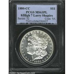 <TR><TD width="100%"><TABLE cellSpacing=1 cellPadding=3 width="100%" border=0><TBODY><TR><TD width="100%" bgColor=#79735c><FONT face=arial color=#ffffff size=3><B>Description</B> </FONT></TD></TR><TR><TD width="100%" bgColor=#ffffff><FONT face=arial size=2><B>1880-CC $1 8 Over High 7 MS63 Prooflike PCGS.</B></I> Ex: Larry Shapiro. VAM-5. Top 100 Variety. The wreath is not fully struck, but this obviously prooflike representative has attractive surfaces. The obverse is essentially brilliant, while the reverse has wisps of tan-russet color. Population: 5 in 63 as Prooflike, 13 finer (4/03). </FONT></TD></TR></TBODY></TABLE></TD></TR></TBODY></TABLE><BR><A name=PricesRealized></A><TABLE cellSpacing=0 cellPadding=0 width="100%" bgColor=#000000 border=0><TBODY><TR><TD width="100%"><TABLE cellSpacing=1 cellPadding=3 width="100%" border=0><TBODY><TR><TD width="100%" bgColor=#79735c><A name=PR><FONT face=arial color=#ffffff size=3><B>Previous Prices from Heritage Auctions</B> </FONT></A></TD></TR><TR><TD bgColor=#f6f6ed><TABLE cellSpacing=0 cellPadding=0 width="100%" border=1><TBODY><TR><TD align=middle width="33%"><B>Date</B></TD><TD align=middle width="33%"><B>Service</B></TD><TD align=middle width="33%"><B>Price</B></TD></TR><TR bgColor=whitesmoke><TD width="33%"><B>07/29/2002</B></TD><TD width="33%">ANACS</TD><TD width="33%">$299.00</TD></TR></TBODY></TABLE></TD></TR><TR><TD bgColor=#ffffff><FONT face=arial size=1 ?>PLEASE NOTE: All prices realized reflect the final hammer price PLUS the buyer's premium in auctions that charge a buyer's premium. Each item has a notation at the top of the listing indicating whether that lot included a buyer's premium. Example: A item that sells with a final hammer price of $100 and a 20% buyer's premium will display with a price realized of $120. All information listed is intended to be as accurate as possible, but errors are possible. Please use this guide carefully and inform us of any inaccuracies. </FONT></TD></TR></TBODY></TABLE></TD></TR></TBODY></TABLE><BR><TABLE cellSpacing=0 cellPadding=0 width="100%" bgColor=#000000 border=0><TBODY><TR><TD width="100%"><TABLE cellSpacing=1 cellPadding=3 width="100%" border=0><TBODY><TR><TD width="100%" bgColor=#79735c colSpan=6><FONT face=arial color=#ffffff size=3><B>Price Guide*</B> </FONT></TD></TR><TR bgColor=#f6f6ed><TD align=middle><B>Grade</B> </TD><TD align=middle><B>Coin World<BR>(Trends)</B> </TD><TD align=middle><B>Numismedia<BR>Retail</B> </TD><TD align=middle><B>Numismedia<BR>Wholesale</B> </TD><TD align=middle><B>Coin<BR>Universe</B> </TD><TD align=middle><B>Heritage<BR>Value Index</B> </TD></TR><TR bgColor=#ffffff><TD align=middle>62</TD><TD align=right>---</TD><TD align=right>---</TD><TD align=right>---</TD><TD align=right>$230.00</TD><TD align=right>$220.50</TD></TR><TR style="FONT-WEIGHT: bold" bgColor=#cccfdd><TD align=middle>63</TD><TD align=right>---</TD><TD align=right>---</TD><TD align=right>---</TD><TD align=right>$450.00</TD><TD align=right>$315.00</TD></TR><TR bgColor=#ffffff><TD align=middle>64</TD><TD align=right>---</TD><TD align=right>---</TD><TD align=right>---</TD><TD align=right>$600.00</TD><TD align=right>$420.00</TD></TR><TR bgColor=#ffffff><TD colSpan=6><FONT size=1>*All information listed is intended to be as accurate as possible, but errors are possible. No item may be returned or refused based on this information which is provided as a service to our customers. You should contact each pricing source directly to determine the accuracy of this information. </FONT></TD></TR></TBODY></TABLE></TD></TR></TBODY></TABLE><BR><TABLE cellSpacing=0 cellPadding=0 width="100%" bgColor=#000000 border=0><TBODY><TR><TD width="100%"><TABLE cellSpacing=1 cellPadding=3 width="100%" border=0><TBODY><TR><TD width="100%" bgColor=#79735c><FONT face=arial color=#ffffff size=3><B>Population Guide</B> </FONT></TD></TR><TR bgColor=#ffffff><TD align=middle><!-- Begin Output of Population Grid--><TABLE cellSpacing=0 cellPadding=0 width="100%" border=0><TBODY><TR><TD vAlign=center><TABLE cellSpacing=0 width="100%" border=1 cellsadding="3"><TBODY><TR><TD vAlign=center><TABLE cellSpacing=0 cellPadding=3 width="100%" border=1><TBODY><TR><TD vAlign=center align=middle bgColor=#f0f1e8 colSpan=2 <CENTER><FONT face=Arial size=2><B>PCGS Pop </B></FONT><CENTER></CENTER></TD><TD vAlign=center align=middle bgColor=#f0f1e8 colSpan=2><CENTER><FONT face=Arial size=2><B>NGC Pop</B></CENTER></FONT></TD></TR><TR><TD vAlign=center><FONT face=Arial size=2>(63)</FONT> </TD><TD vAlign=center align=right><FONT face=Arial size=2>5</FONT> </TD><TD vAlign=center><FONT face=Arial size=2>(63)</FONT> </TD><TD vAlign=center align=right><FONT face=Arial size=2>0</FONT> </TD></TR><TR><TD vAlign=center><FONT face=Arial size=2>(>63)</FONT> </TD><TD vAlign=center align=right><FONT face=Arial size=2>13</FONT> </TD><TD vAlign=center><FONT face=Arial size=2>(>63)</FONT> </TD><TD vAlign=center align=right><FONT face=Arial size=2>0</FONT> </TD></TR></TBODY></TABLE></TD></TR></TBODY></TABLE></TD></TR></TBODY></TABLE><!-- End Output of Population Grid--></TD></TR></TBODY></TABLE></TD></TR></TBODY></TABLE><BR><TABLE cellSpacing=0 cellPadding=0 width="100%" bgColor=#000000 border=0><TBODY><TR> Important notice: We expect to be auctioning lots at the rate of 200-250 per hour. On occasion eBay live bid software cannot keep up with the pace of the auctions where 4-5 lots per minute can hammer down, so we recommend that you place a realistic absentee bid now as insurance to avoid disappointment. Also please note that all Heritage/CAA lots purchased through eBay Live carry a 20% Buyer's Premium. Please make sure you read the Terms and Conditions.