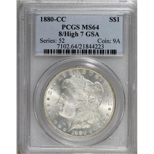 <B>1880-CC $1 8 Over High 7 MS64 PCGS.</B></I> VAM-5. A Top 100 Variety. The 7 underdigit is unmistakable, unlike many of the claimed 8 over 7 VAMS from the various mints for this date. This is a crisply struck and virtually stone-white near-Gem that has only minor grazes near the mouth and chin.<BR><BR><B>Coin Engraver:</B> George T. Morgan<BR><BR><b>Shipping:</b> Coins & Currency (<a target="_blank" href="http://www.heritageauctions.com/common/shipping.php">view shipping information</a>)