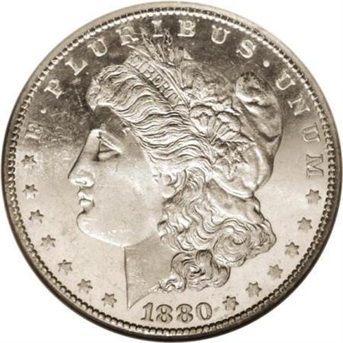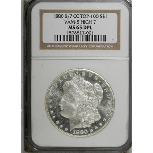 <B>1880-CC $1 8 Over High 7 MS65 Deep Prooflike NGC.</B></I> VAM-5. A Top 100 Variety. This is a remarkably frosty Gem with bright snow-white surfaces that show some cloudiness and a few die polish lines in the fields. All of the design elements are well struck, and the surfaces are impressively preserved. NGC has only certified six examples of this VAM variety with Deep Prooflike surfaces, and this piece is the single highest-graded of those six coins (9/07). <BR><BR><b>Shipping:</b> Coins & Currency (<a target="_blank" href="http://www.heritageauctions.com/common/shipping.php">view shipping information</a>)