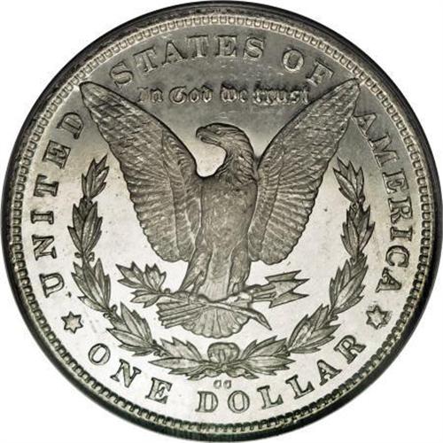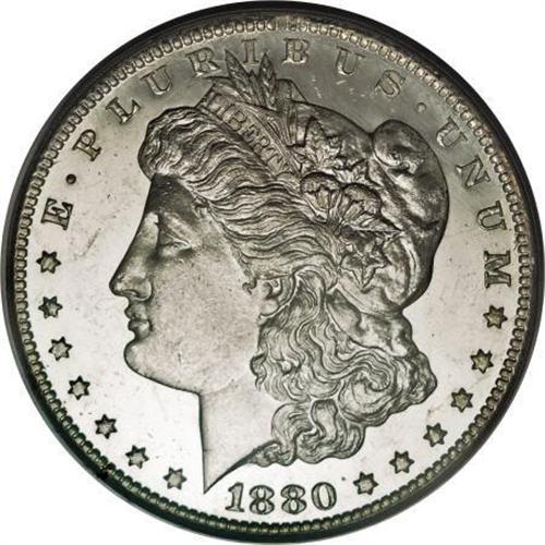 <B>1880-CC $1 8 Over High 7 MS65 Deep Mirror Prooflike PCGS.</B></I> VAM-5. A Top 100 Variety. A stunning white Gem with deeply mirrored fields on each side. The obverse and reverse devices are frosty and highly lustrous. Few Deep Mirror Prooflike examples of this variety appear on the market, and when they do, Morgan dollar collectors delight at the opportunity. Population: 6 in 65 DMPL, 1 finer (1/08).<BR><BR><b>Shipping:</b> Coins & Currency (<a target="_blank" href="http://www.heritageauctions.com/common/shipping.php">view shipping information</a>)